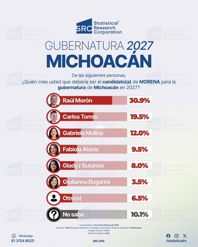 Morelia, Mich., a 03 de marzo de 2026.- A poco más de un mes para que Morena defina su candidatura hacia la gubernatura de Michoacán en 2027, las encuestas reflejan un escenario de clara ventaja para el senador Raúl Morón Orozco, así lo muestra el más reciente estudio de Statistical Research Corporation (SRC), en donde el profesor se mantiene firme en la cima de las preferencias ciudadanas con una ventaja de doble dígito.