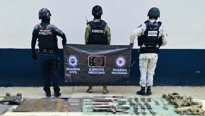 En la localidad de La Ruana de esta demarcación, los efectivos de la Guardia Civil, el Ejército Mexicano y la Guardia Nacional decomisaron cuatro armas de fuego calibre 7.62X39 milímetros y una calibre .223 milímetros, así como 410 cartuchos útiles y 18 cargadores, además de equipo táctico.