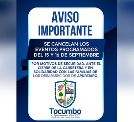 Entre los Gobiernos municipales que decidieron suspender la conmemoración del grito de independencia se hallan el Ayuntamiento de Tocumbo, que encabeza el alcalde José Luis Alcázar Rodríguez, quien dio a conocer la cancelación de las festividades patrias.