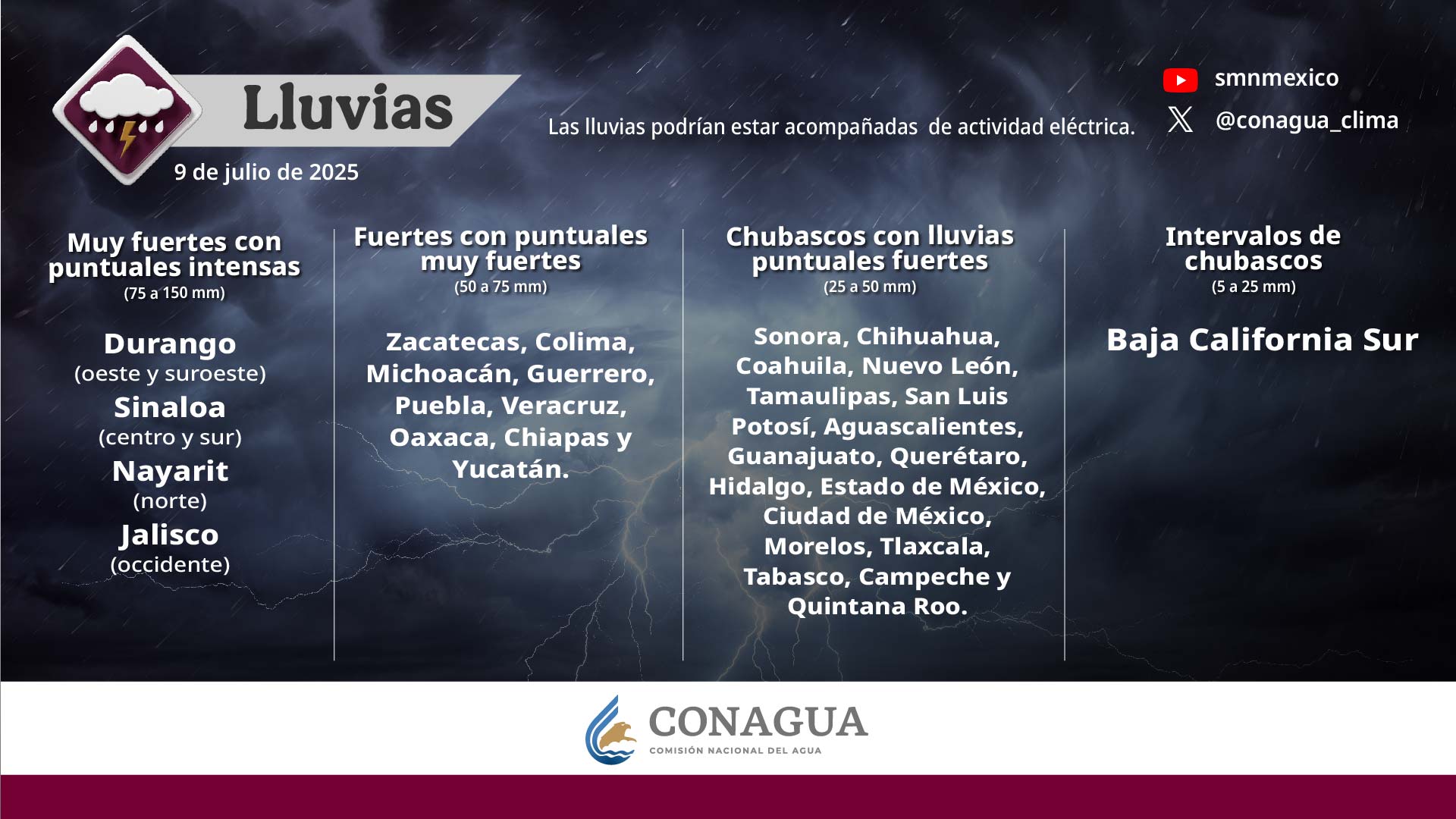 Para este miércoles, se pronostican lluvias puntuales intensas (de 75 a 150 milímetros [mm]) en Durango (oeste y suroeste), Sinaloa (centro y sur), Nayarit (norte) y Jalisco (occidente); muy fuertes (de 50 a 75 mm) en Zacatecas, Colima, Michoacán, Guerrero, Puebla, Veracruz, Oaxaca, Chiapas y Yucatán; fuertes (de 25 a 50 mm) en Sonora, Chihuahua, Coahuila, Nuevo León, Tamaulipas, San Luis Potosí, Aguascalientes, Guanajuato, Querétaro, Hidalgo, Estado de México, Ciudad de México, Morelos, Tlaxcala, Tabasco, Campeche y Quintana Roo, así como chubascos (de 5 a 25 mm) en Baja California Sur.