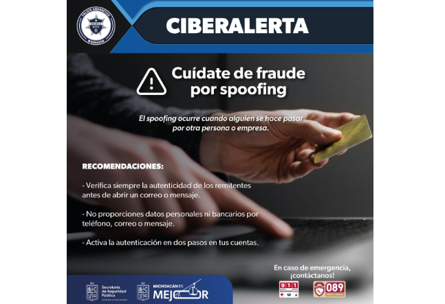 Morelia, Mich., a 20 de agosto de 2025.- Las tareas de investigación e inteligencia que realiza el personal de la Secretaría de Seguridad Pública (SSP), han permitido descubrir una modalidad de fraude en línea llamado “spoofing”, que consiste en la suplantación de identidad de una persona o empresa.