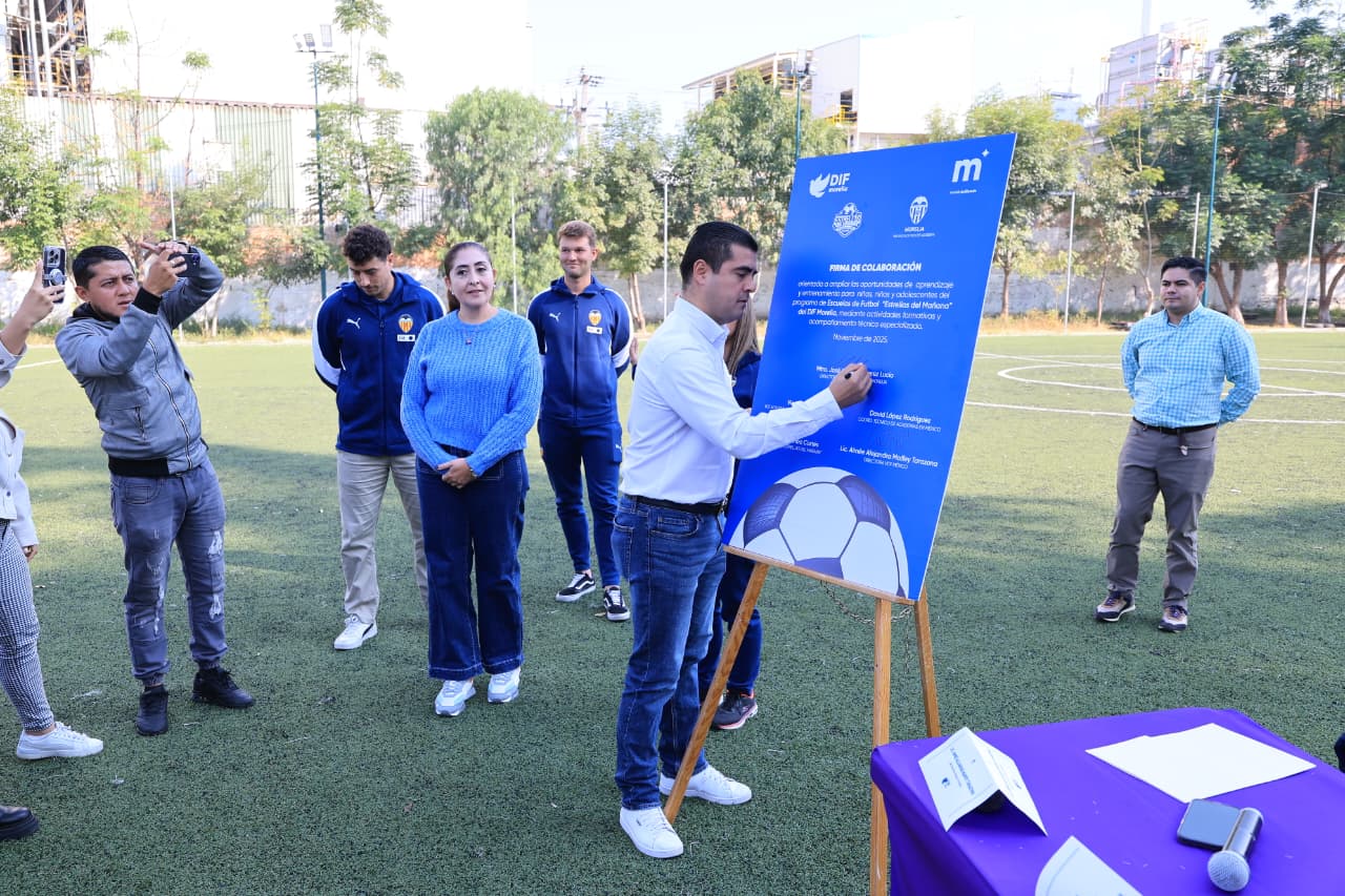 Morelia, Michoacán, a 19 de noviembre de 2025.- El Ayuntamiento de Morelia, a través del Sistema DIF Municipal, formalizaron la firma de un convenio de colaboración con el Valencia Club de Fútbol, cuyo propósito es ampliar las oportunidades de aprendizaje, entrenamiento y desarrollo integral para niñas, niños y adolescentes del programa Escuelas de Fútbol “Estrellas del Mañana”.