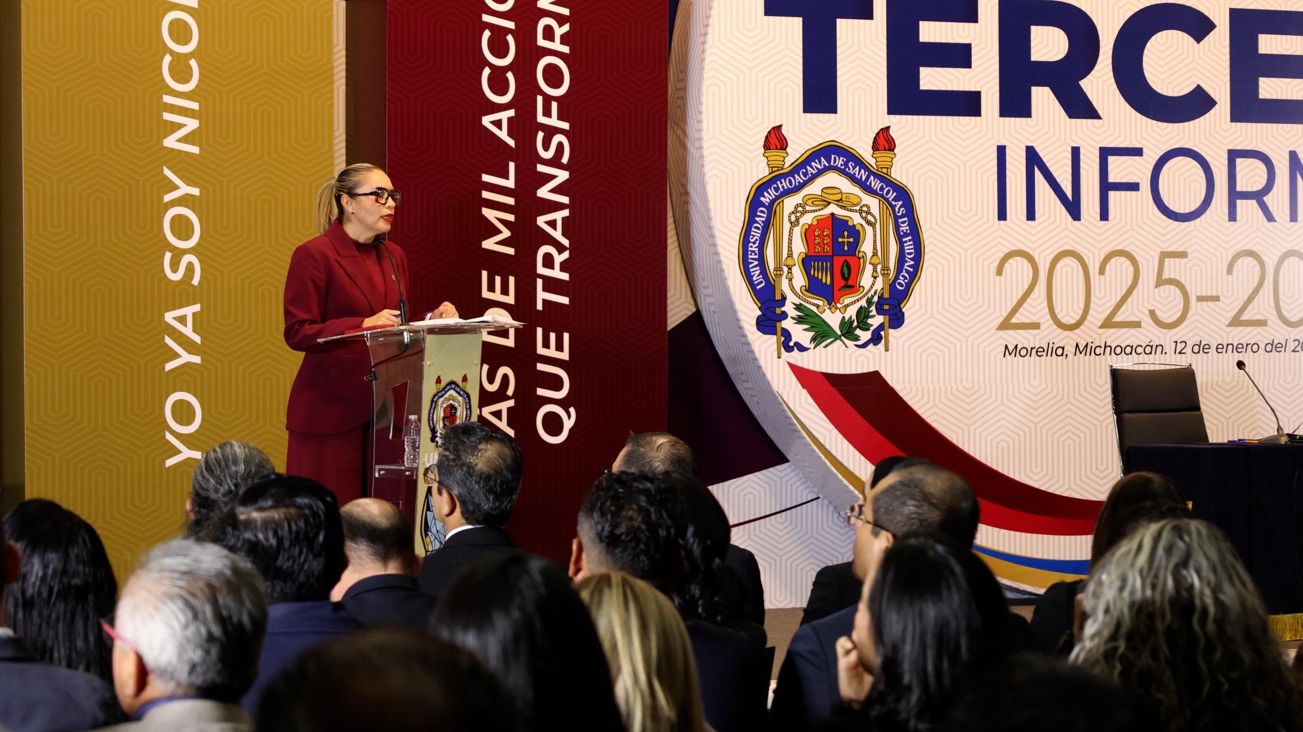 Morelia, Michoacán, a 13 de enero de 2026.- Al dar a conocer diversos logros alcanzados en materia deportiva durante el Tercer Año de Labores, la rectora de la Universidad Michoacana de San Nicolás de Hidalgo (UMSNH), Yarabí Ávila González, consideró que en este renglón “pudiéramos decir que alcanzamos la gloria”.