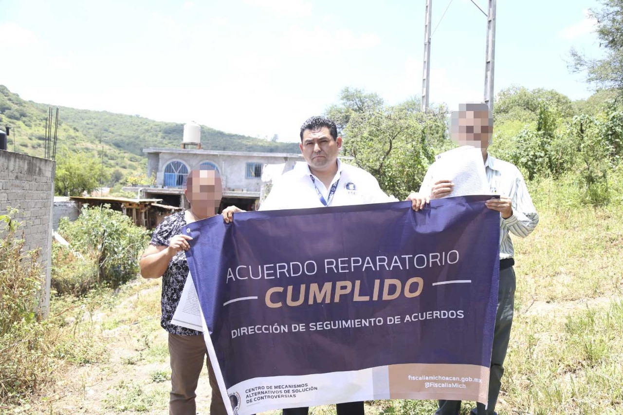 Morelia, Mich., a 28 de agosto de 2025.- La Fiscalía General del Estado de Michoacán (FGE), a través del Centro de Mecanismos Alternativos de Solución de Controversias (CMASC), celebró un acuerdo reparatorio que permitió restituir un inmueble a su legítimo propietario, víctima de despojo en el municipio de Tarímbaro.