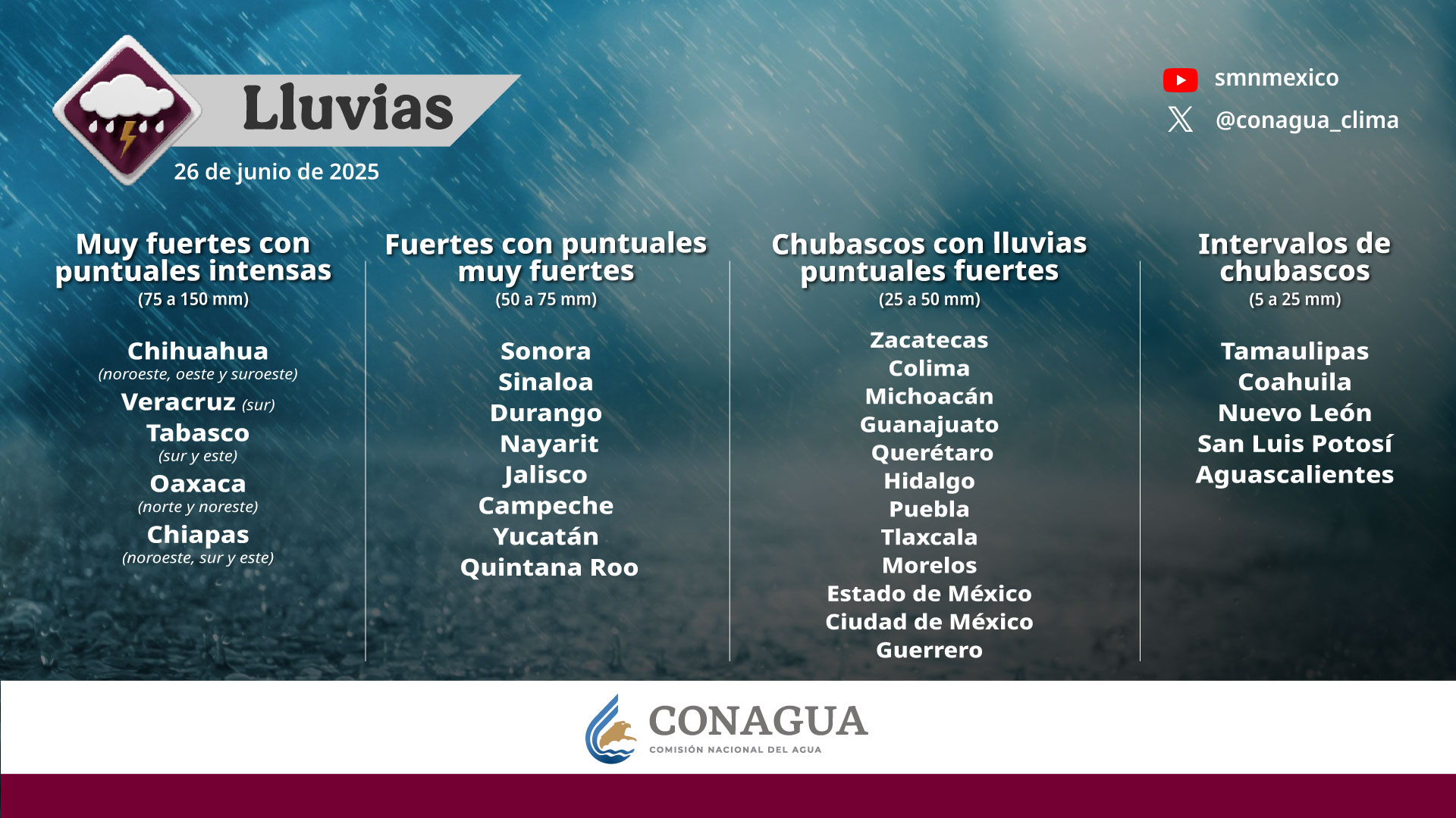 Para este jueves, debido a la atmosfera húmeda, saturada e inestable, continuará el temporal de lluvias sobre gran parte del territorio nacional, por lo que se pronostican lluvias puntuales intensas (de 75 a 150 milímetros [mm]) en Chihuahua, Veracruz (sur), Tabasco (sur y este), Oaxaca (norte y noreste) y Chiapas (noroeste, sur y este); muy fuertes (de 50 a 75 mm) en Sonora, Sinaloa, Durango, Nayarit, Jalisco, Campeche, Yucatán y Quintana Roo; fuertes (de 25 a 50 mm) en Zacatecas, Colima, Michoacán, Guanajuato, Querétaro, Hidalgo, Puebla, Tlaxcala, Morelos, Estado de México, Ciudad de México y Guerrero, así como chubascos (de 5 a 25 mm) en Tamaulipas, Coahuila, Nuevo León, San Luis Potosí y Aguascalientes.