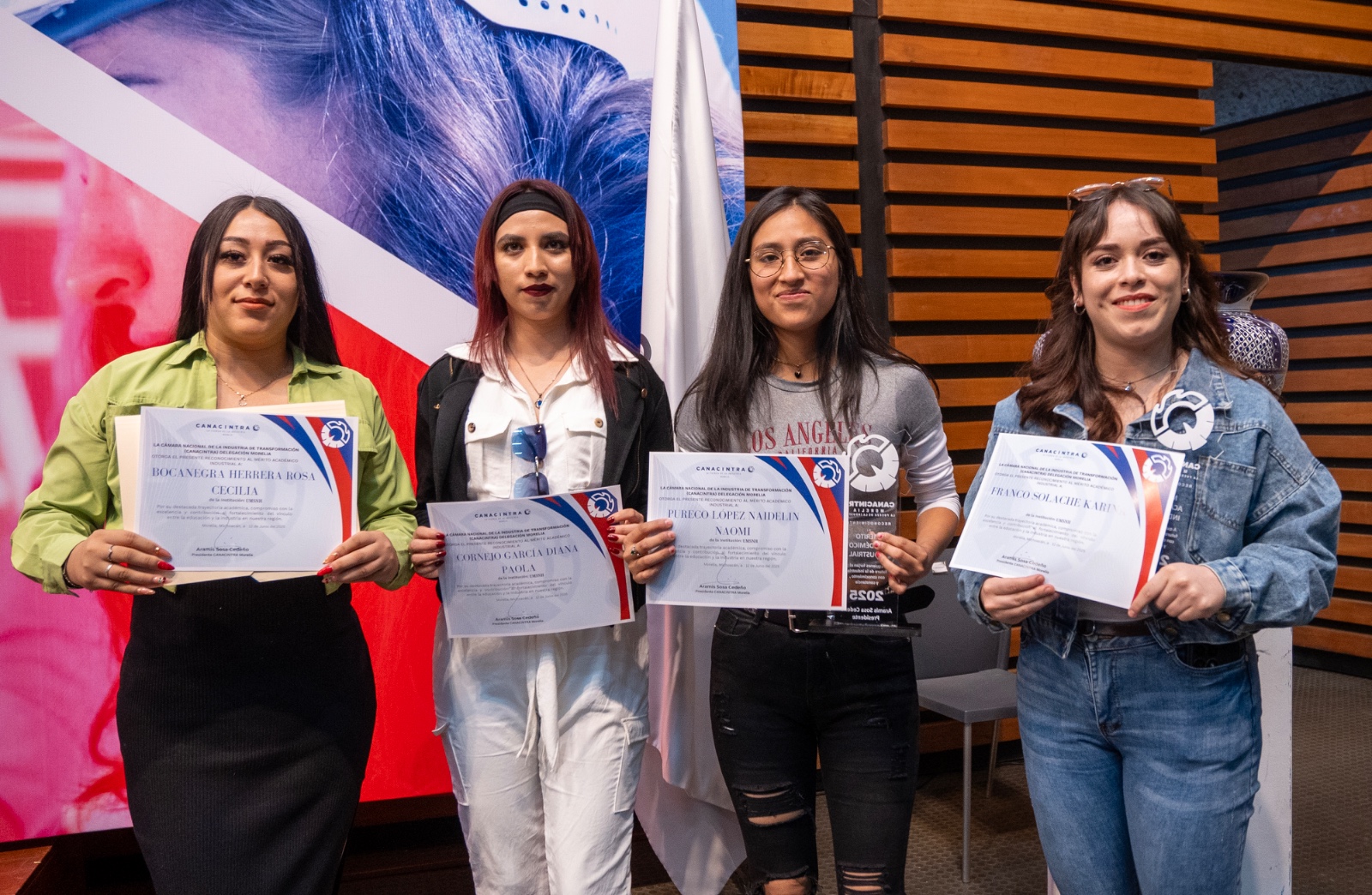 Las alumnas y alumnos nicolaitas que recibieron el reconocimiento al Mérito Académico Industrial por parte de la CANACINTRA fueron: de la Facultad de Ingeniería Mecánica, Marlon Armando García Alcázar, Mario Alberto Esquivel Talavera, Jereth Sharadan Pino Chacón, Yoltinemi Román Huijón, Luis Ángel Becerril Hernández, Héctor García Tapia, Jimena Rivas Varela, Itzel Estefanía Montoya Díaz y Juan Diego Escamilla Torres.