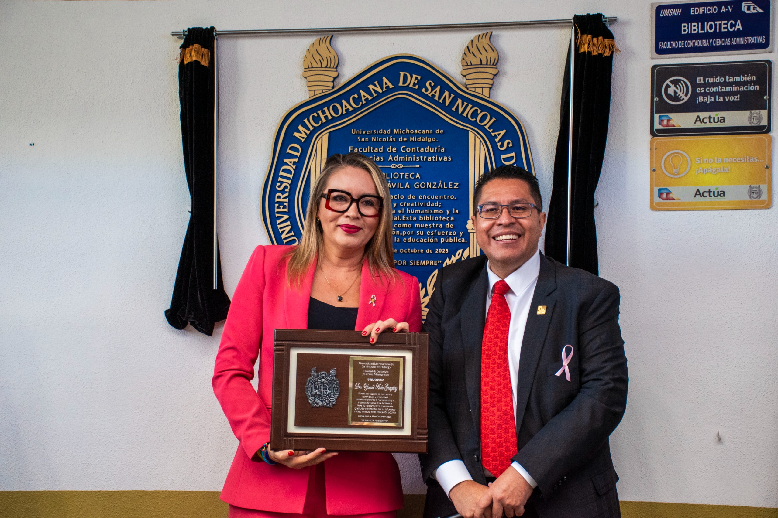 Morelia, Michoacán, a 22 de octubre de 2025.- En el marco de la conmemoración del 65 aniversario de la Facultad de Contaduría y Ciencias Administrativas (FCCA), se hizo un reconocimiento a la trayectoria de la rectora de la Universidad Michoacana de San Nicolás de Hidalgo (UMSNH), Yarabí Ávila González, como egresada de esta dependencia.
