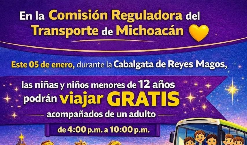 Morelia, Michoacán, a 4 de enero de 2026.– Con motivo de la Cabalgata de Reyes Magos, el Gobierno de Morelia, encabezado por el Presidente Municipal Alfonso Martínez Alcázar, en coordinación con la Comisión Reguladora de Transporte (CRT), ofrecerá transporte público gratuito para niñas y niños menores de 12 años este próximo 05 de enero.