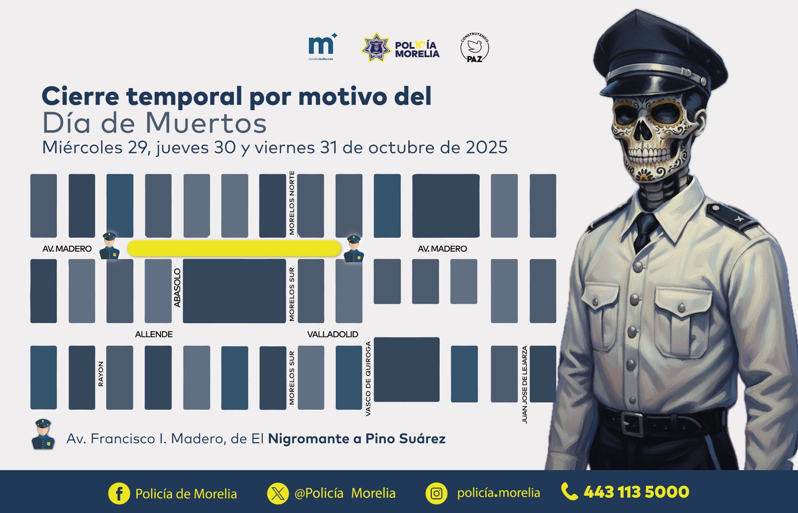A partir del miércoles 29, jueves 30 y viernes 31 de octubre, se efectuarán cierres a la circulación al atardecer, en la Avenida Francisco I. Madero, desde la calle El Nigromante hasta Pino Suárez, con el propósito de que las morelianas y morelianos disfruten el Centro Histórico caminando, de acuerdo con el desarrollo de los eventos programados en el primer cuadro de la ciudad.