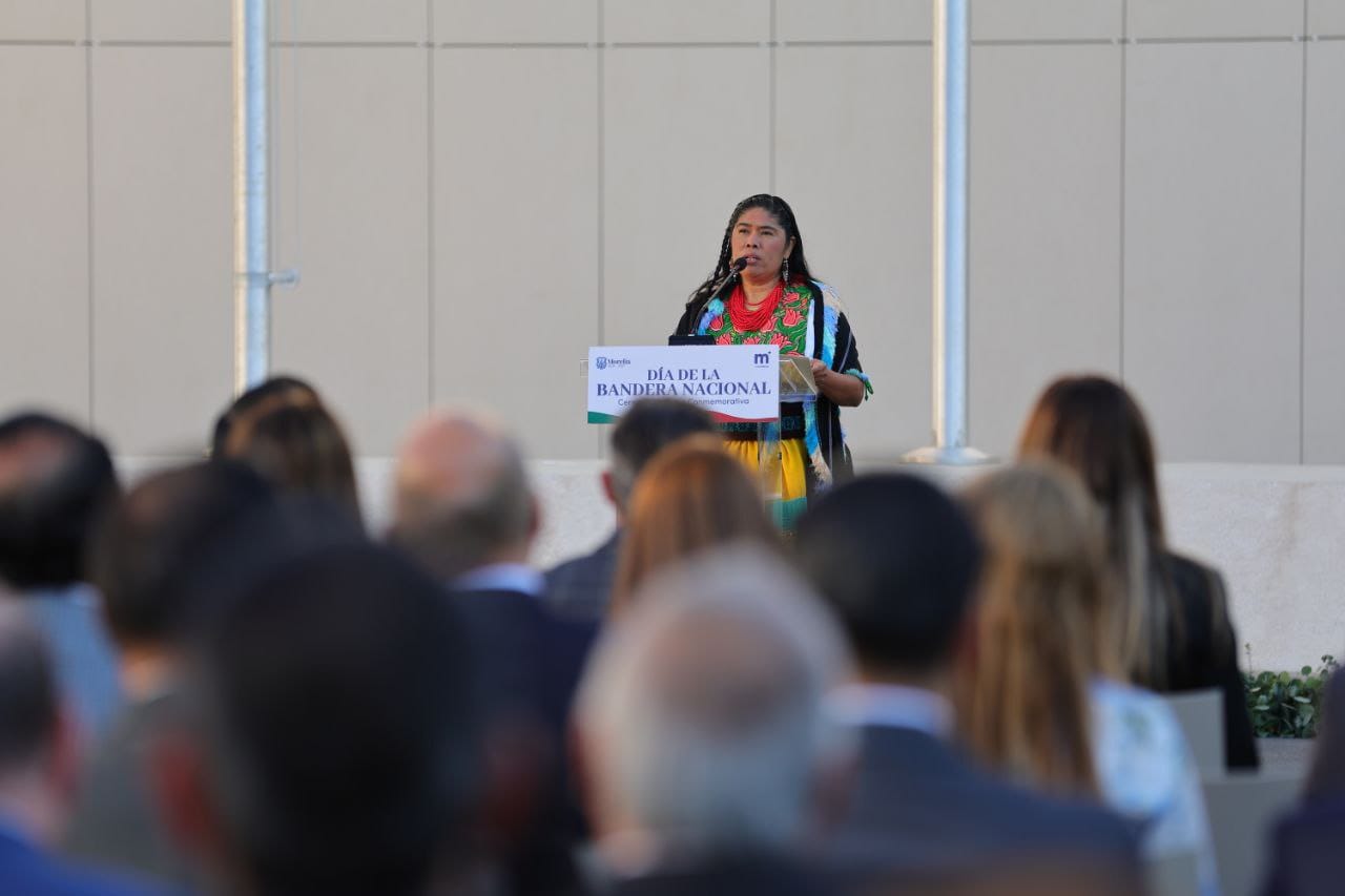 Durante su intervención, resaltó que la Bandera mexicana sintetiza la historia de México, los héroes y heroínas de nuestro país: “La Bandera representa el espíritu de unidad de un país que tiene su origen en nuestras culturas indígenas, por lo tanto, no se debe olvidar que México sigue siendo hoy una nación pluricultural y multilingüe; este origen es el que nos da sentido de identidad y de pertenencia nacional”.