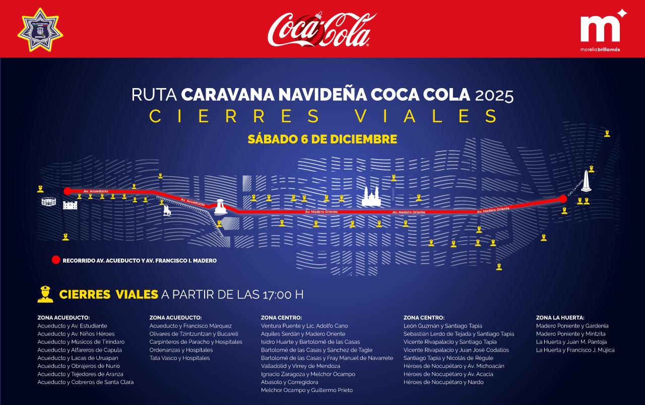 La Policía Morelia desplegará un operativo especial desde las 17:00 horas del sábado 06 de diciembre, con cierres sobre Avenida Acueducto, desde la calle Olivares de Tzintzuntzan (colonia Vasco de Quiroga, a la altura de la XXI Zona Militar) hasta Calzada La Huerta (Monumento a Lázaro Cárdenas). El dispositivo contará también con el apoyo de la Coordinación de Protección Civil y Bomberos Municipal.