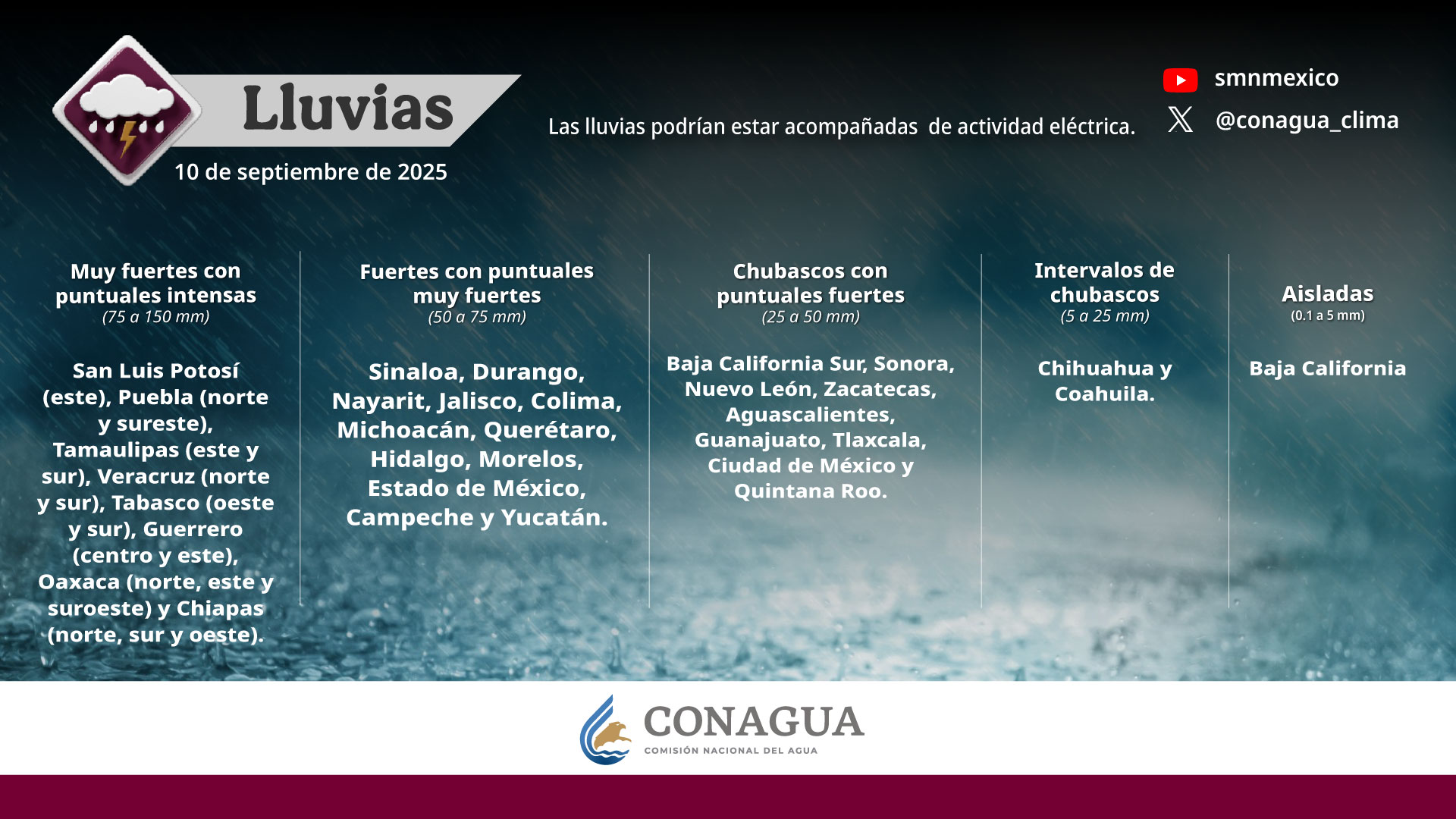 Asimismo, se prevén lluvias fuertes (de 25 a 50 mm) en áreas de Baja California Sur, Sonora, Nuevo León, Zacatecas, Aguascalientes, Guanajuato, Tlaxcala, Ciudad de México y Quintana Roo; intervalos de chubascos (de 5 a 25 mm) en Chihuahua y Coahuila, además de lluvias aisladas (de 0.1 a 5 mm) en Baja California. Todas las lluvias pronosticadas estarán acompañadas con descargas eléctricas, rachas fuertes