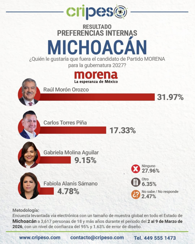 Con el proceso electoral de 2027 en puerta, el senador Raúl Morón Orozco se reafirma como el perfil con mayor respaldo ciudadano para encabezar la candidatura de Morena al Gobierno de Michoacán, de acuerdo a los resultados de la más reciente encuesta de la firma Cripeso, que lo sitúa con una ventaja de 15 puntos porcentuales.