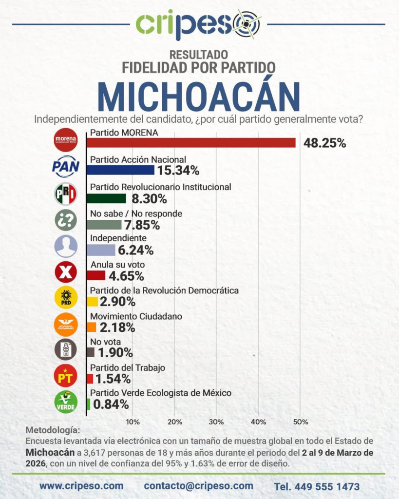 El estudio de Cripeso también midió la fidelidad de voto en la entidad, en donde Morena cuenta con una sólida base del 48.25%. Muy por detrás se encuentran el PAN con 15.34%, el PRI con 8.30% y la opción de candidatos Independientes con un 6.24%.
