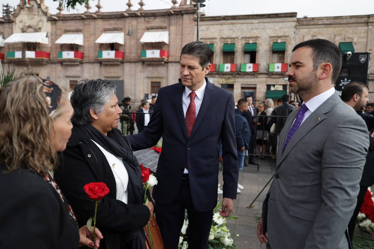 Acompañado por el gobernador Alfredo Ramírez Bedolla, encabezaron la ceremonia de izamiento de bandera a media asta en señal de luto en la Plaza Melchor Ocampo.