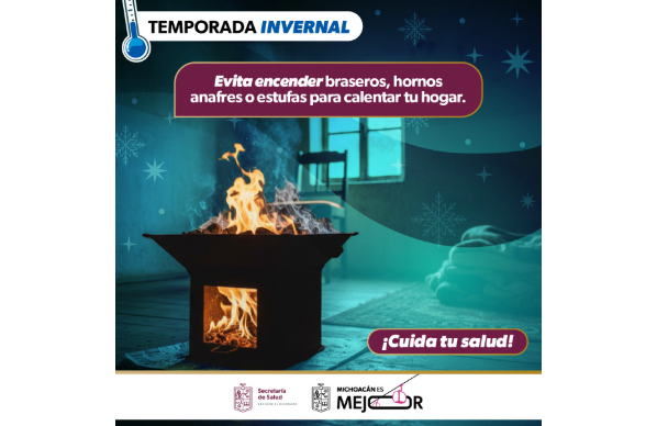 Morelia, Mich., a 6 de noviembre de 2025.- Con la llegada de la temporada de frío, la Secretaría de Salud de Michoacán (SSM) exhorta a la población a no encender anafres, braseros, fogones o estufas dentro de casa, a fin de prevenir intoxicaciones y fallecimientos por monóxido de carbono.