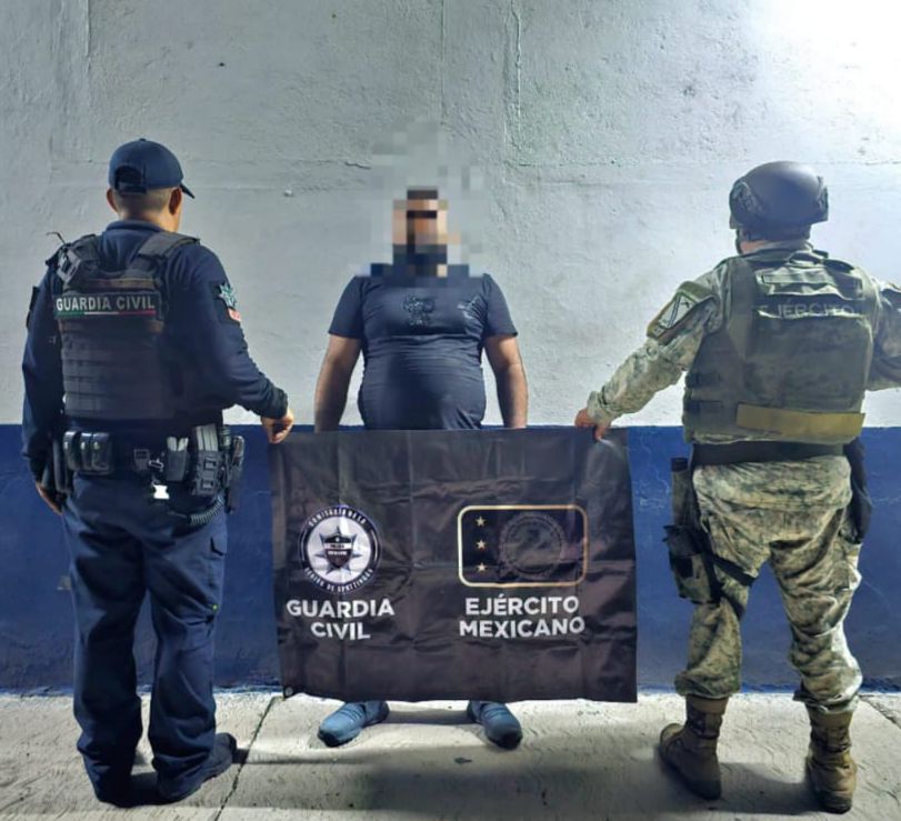 En una primera labor, los efectivos de la Guardia Civil, el Ejército Mexicano y la Guardia Nacional detuvieron en la cabecera municipal a un hombre en portación de un arma de fuego calibre .9 milímetros, cuatro cartuchos útiles y un cargador.