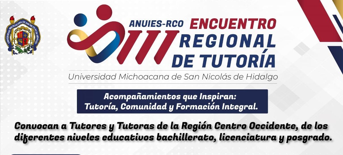 Morelia, Michoacán, a 01 de septiembre de 2025.- La Universidad Michoacana de San Nicolás de Hidalgo (UMSNH) y la Red de Tutorías de la Región Centro Occidente de la Asociación Nacional de Universidades e Instituciones de Educación Superior (ANUIES) invitan al VIII Encuentro Regional de Tutoría «Acompañamientos que Inspiran: Tutoría, Comunidad y Formación Integral», que se llevará a cabo el próximo mes de noviembre.