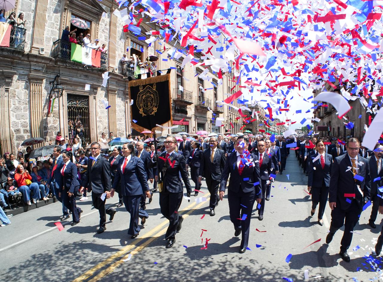 La delegación nicolaita representada por más de 900 docentes, administrativos, directoras, directores, funcionarias, funcionarios, estudiantes y exalumnos, así como por la reconocida Banda de Guerra, desfilaron mostrando una vez más que la Universidad Michoacana no sólo forma profesionales, sino también ciudadanas y ciudadanos comprometidos con su historia y su gente.